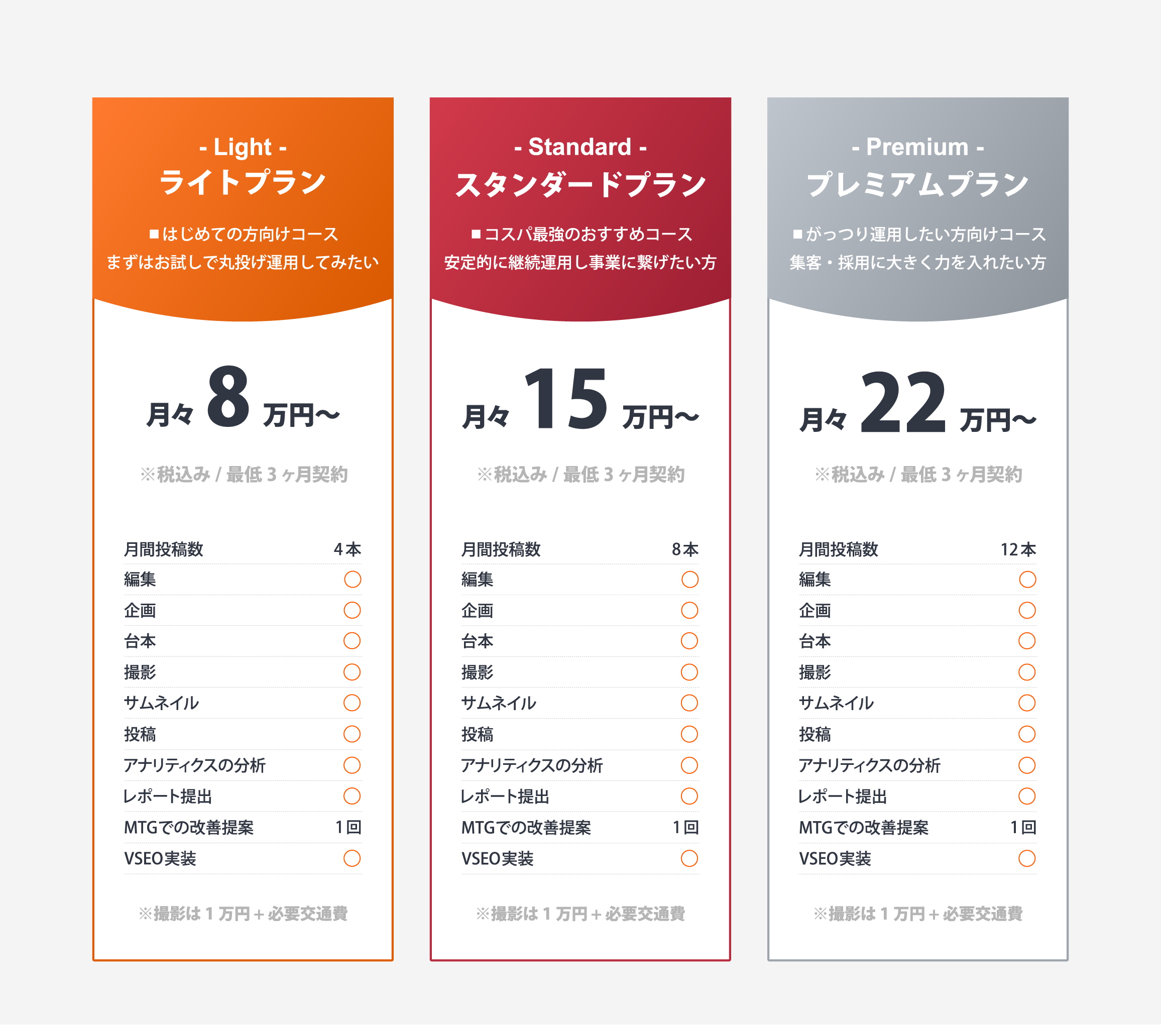 高品質のまま、企業・個人どちらでも依頼しやすい適正価格。 必要以上にコストをかけず、効果が出る動画を実現できる コストパフォーマンスを重視しています。